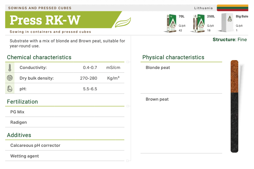 Sustrato de estructura superfina, diseñado para el cultivo de plántulas en contenedores o tacos prensados. Fabricado a partir de una mezcla de turba rubia y negra procedente de Lituania, garantiza una excelente retención de agua y aireación de las raíces. El pH varía entre 5,5 y 6,5, proporcionando un entorno ideal para la germinación.